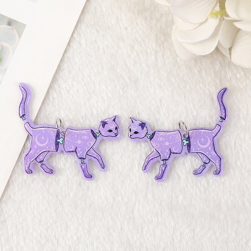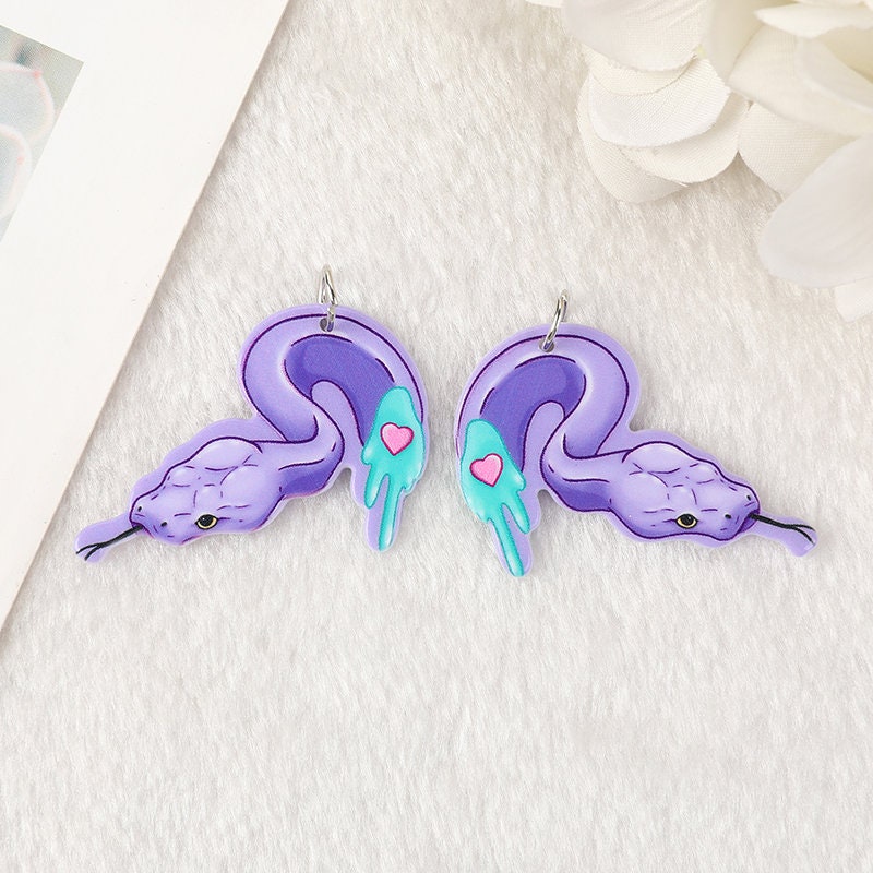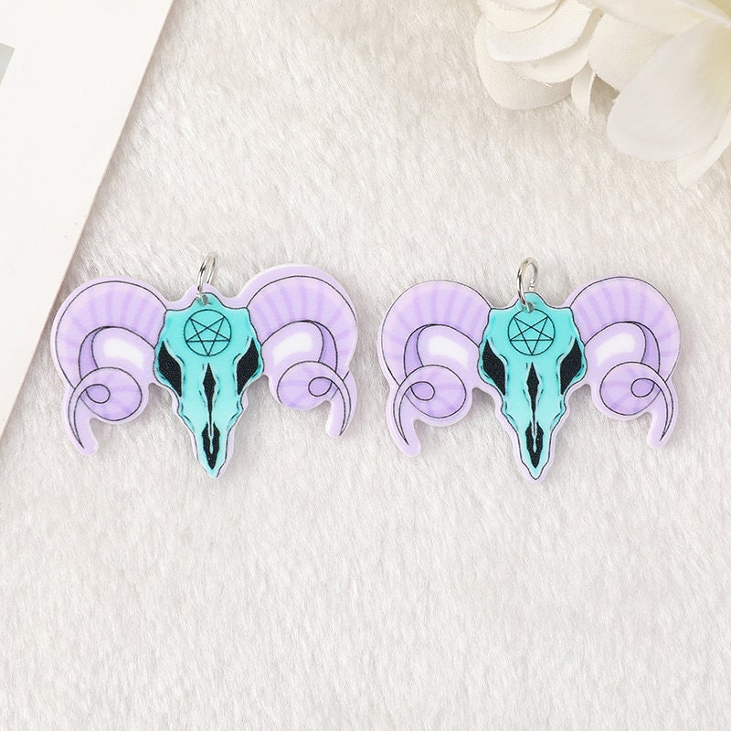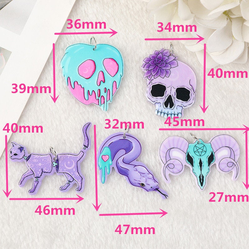 Purple pastel goth acrylic charms featuring skulls, snakes, cats, rams, and dripping apple designs—perfect for unique goth and punk-inspired jewelry projects.