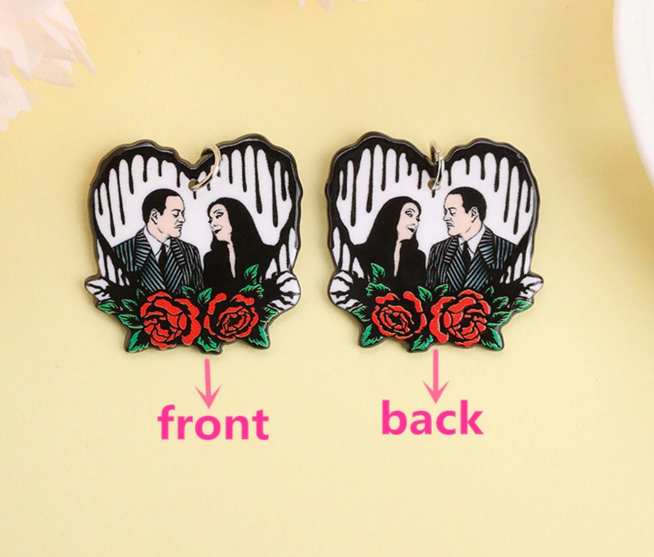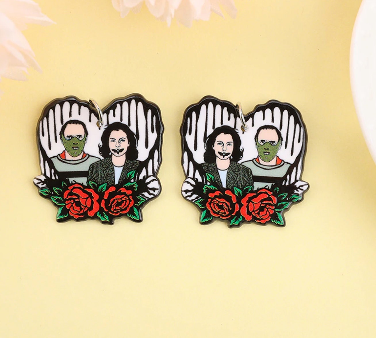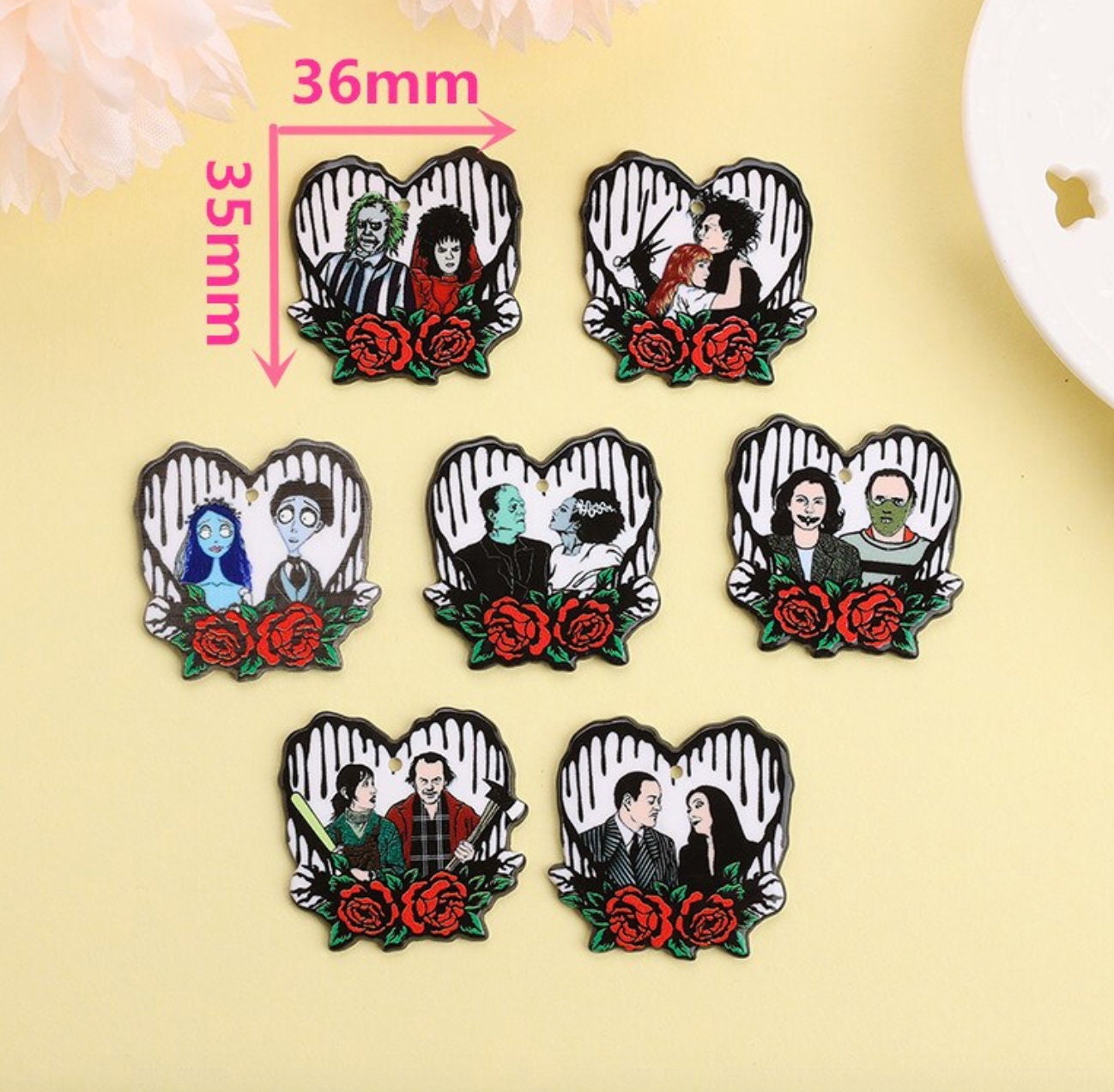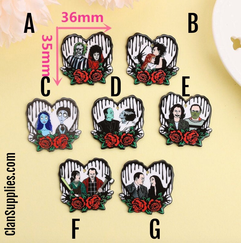 Iconic horror movie couples reimagined as acrylic charms for true scary-movie fans. These bold and spooky designs celebrate the most unforgettable couples in horror cinema, perfect for statement jewelry and dark-themed DIY projects.