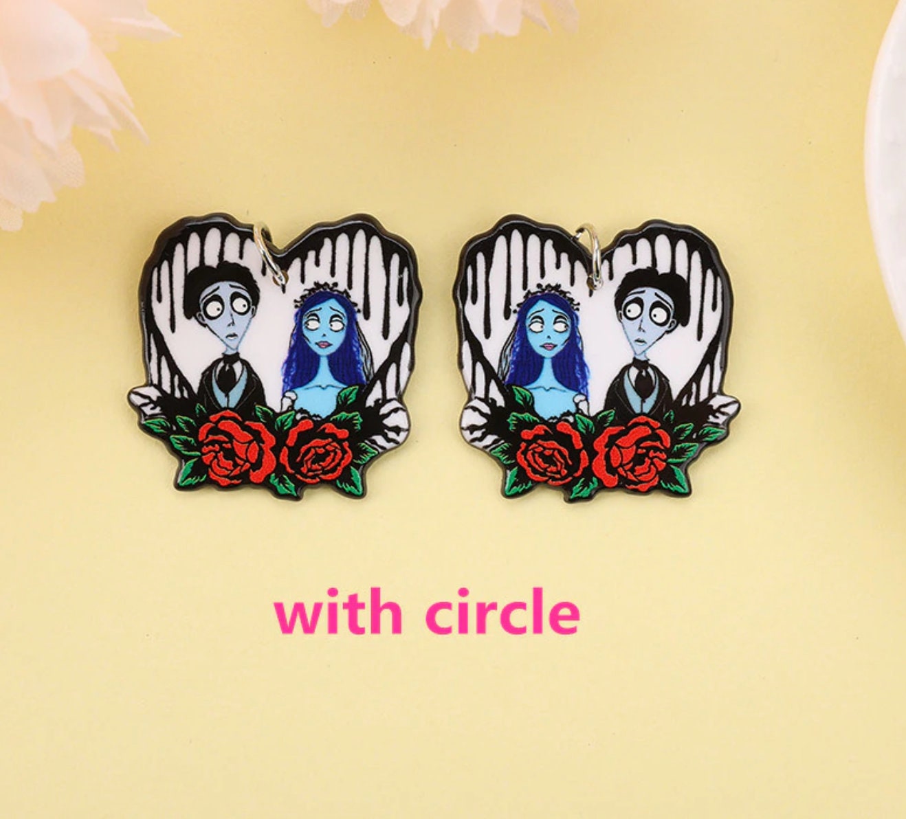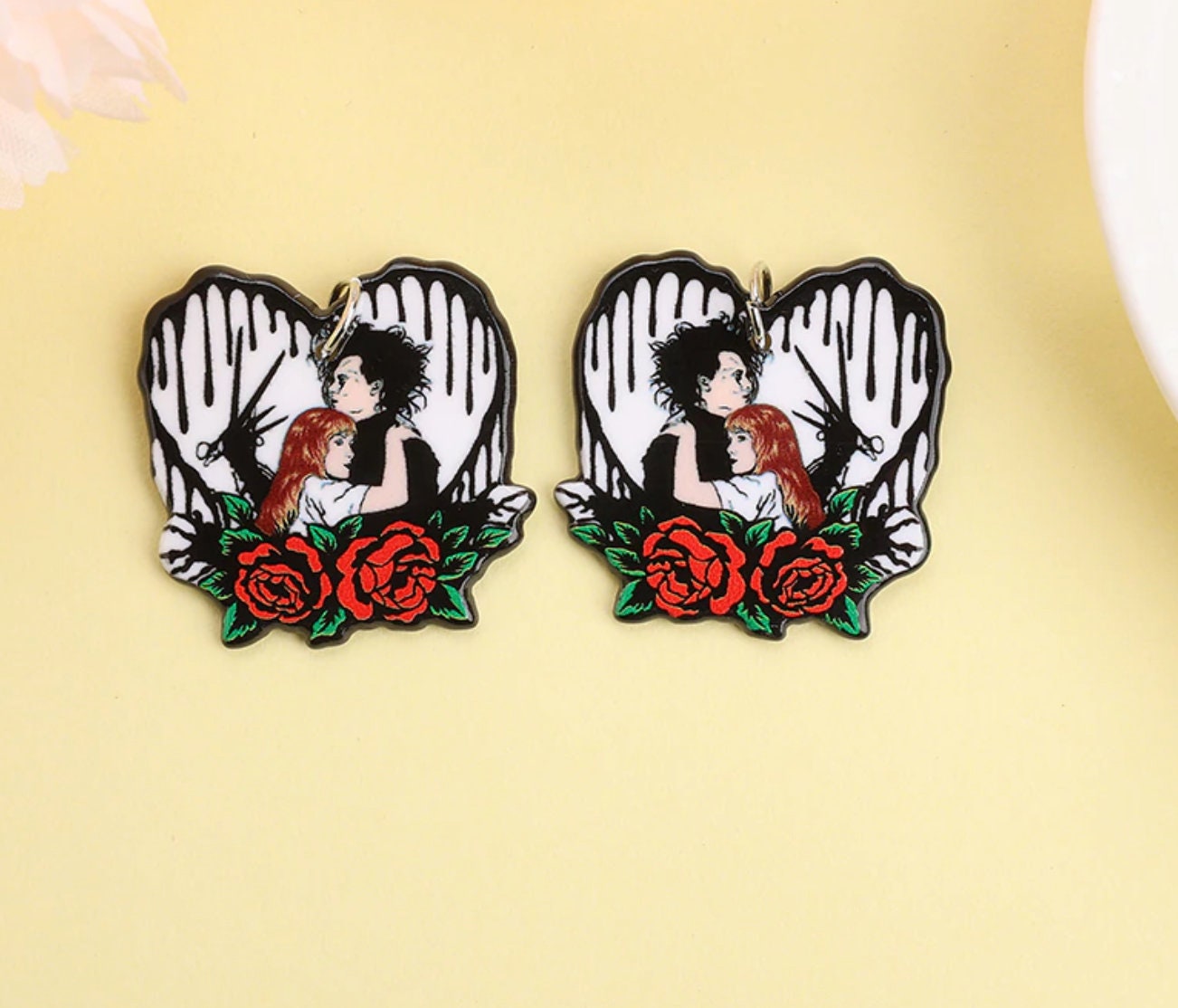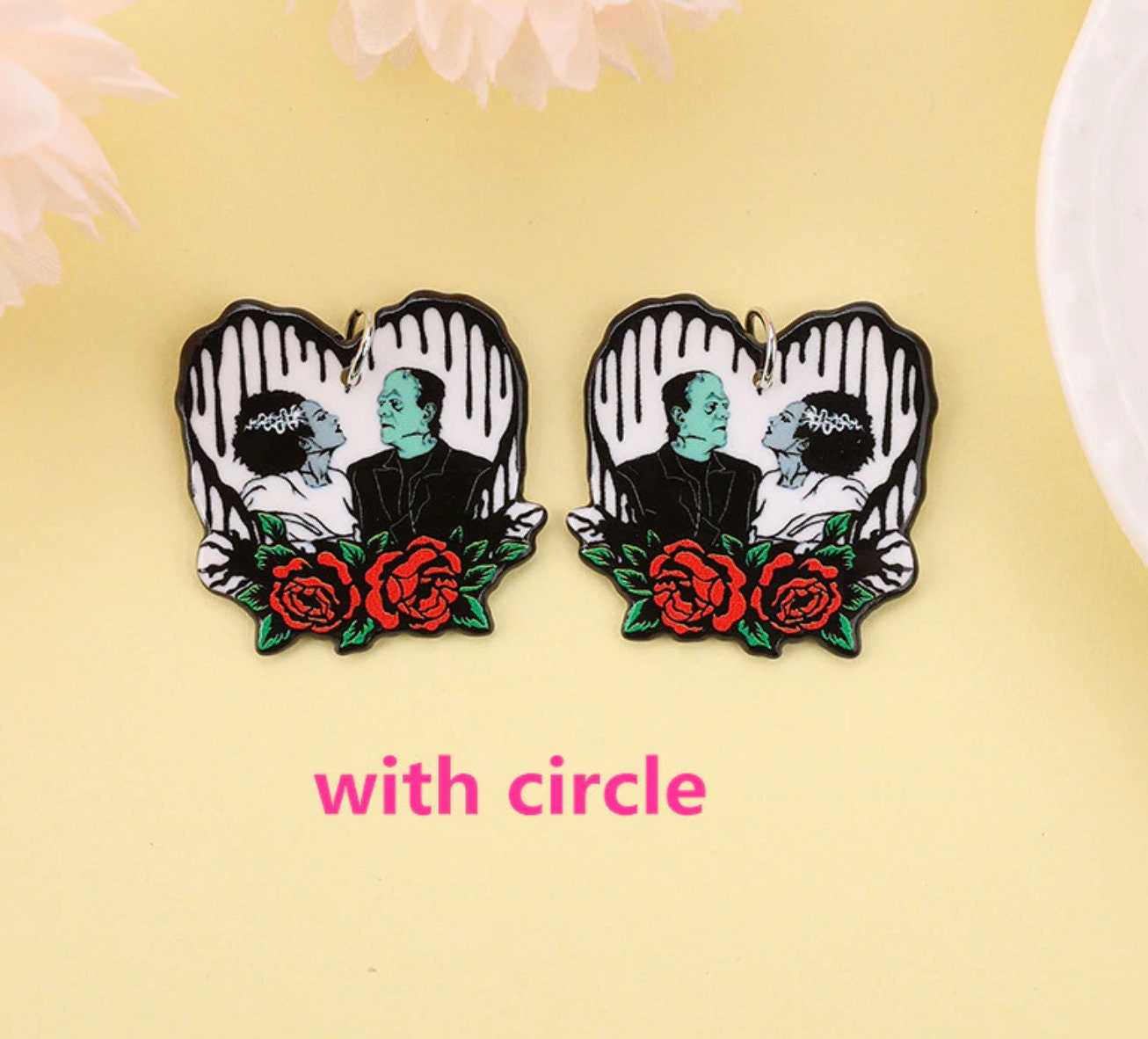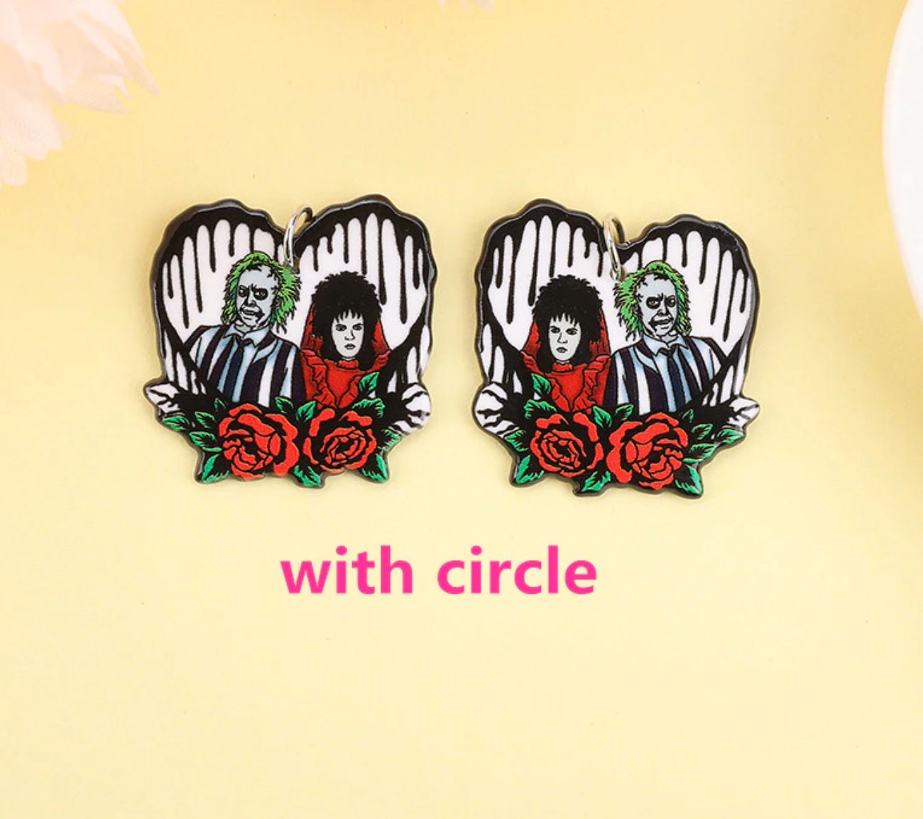Iconic horror movie couples reimagined as acrylic charms for true scary-movie fans. These bold and spooky designs celebrate the most unforgettable couples in horror cinema, perfect for statement jewelry and dark-themed DIY projects.