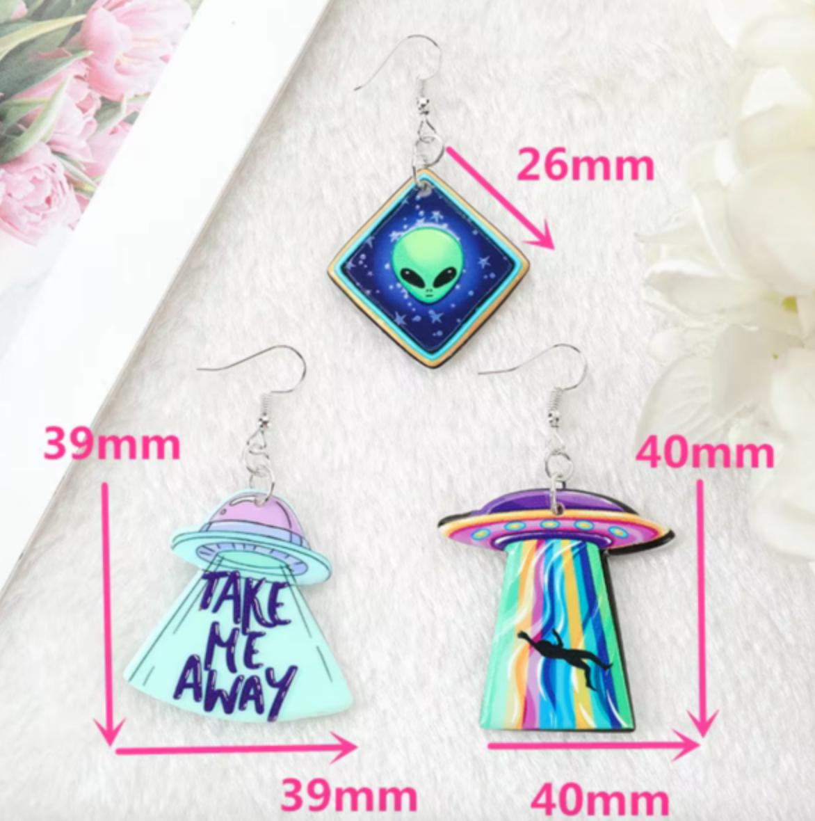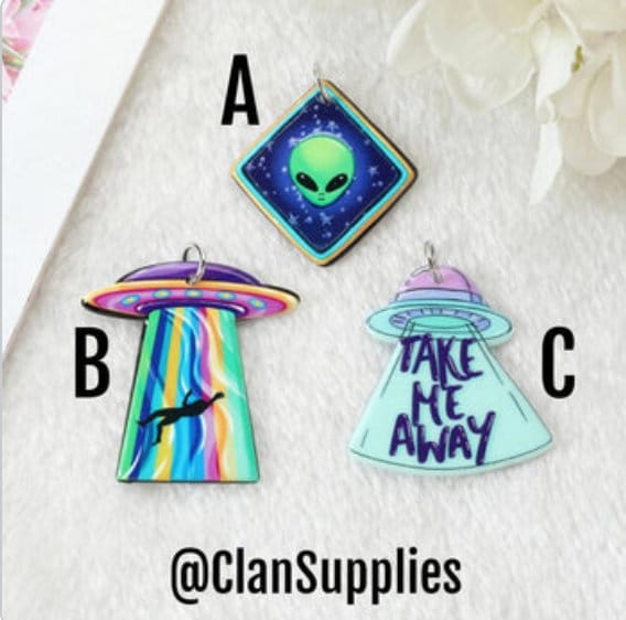 A dreamy pastel goth alien charm collection featuring UFOs, green aliens, rainbow abductions, and “Take Me Away” designs. Perfect for spooky-cute earrings, necklaces, and out-of-this-world DIY jewelry projects.