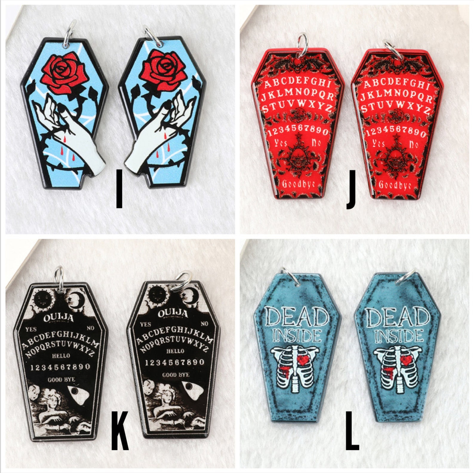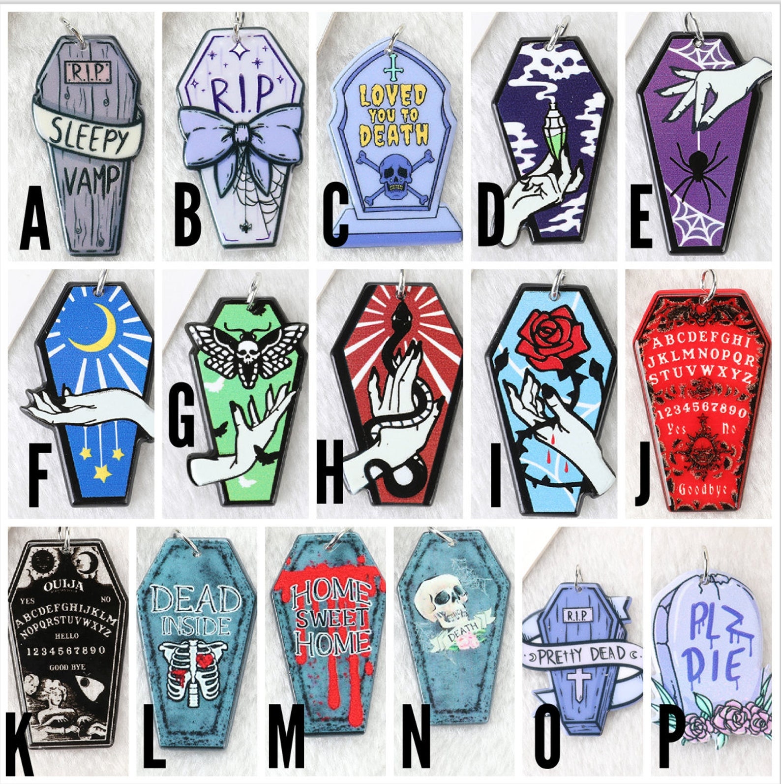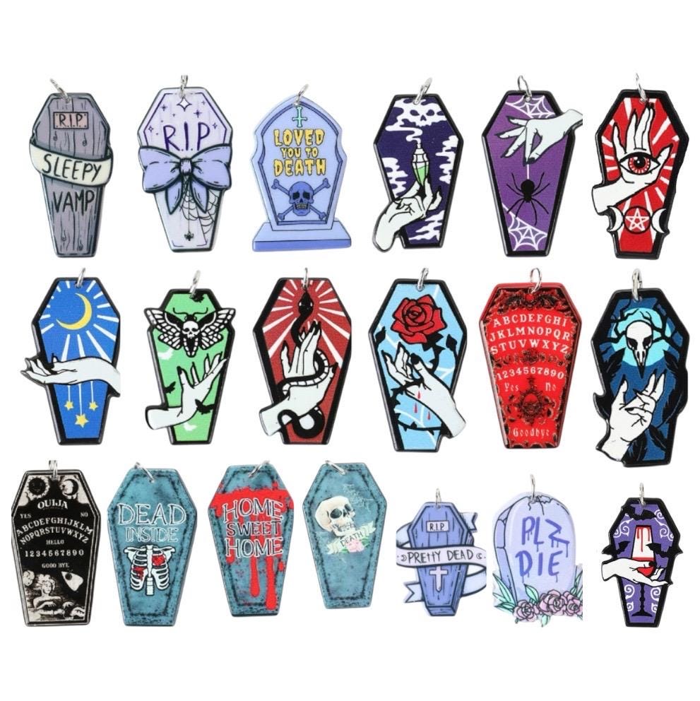 These pastel goth coffin acrylic charms feature ouija boards, tombstones, spooky hands and gothic symbols — perfect for Halloween jewelry and year-round goth vibes.