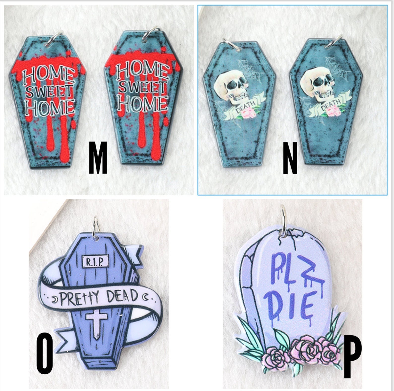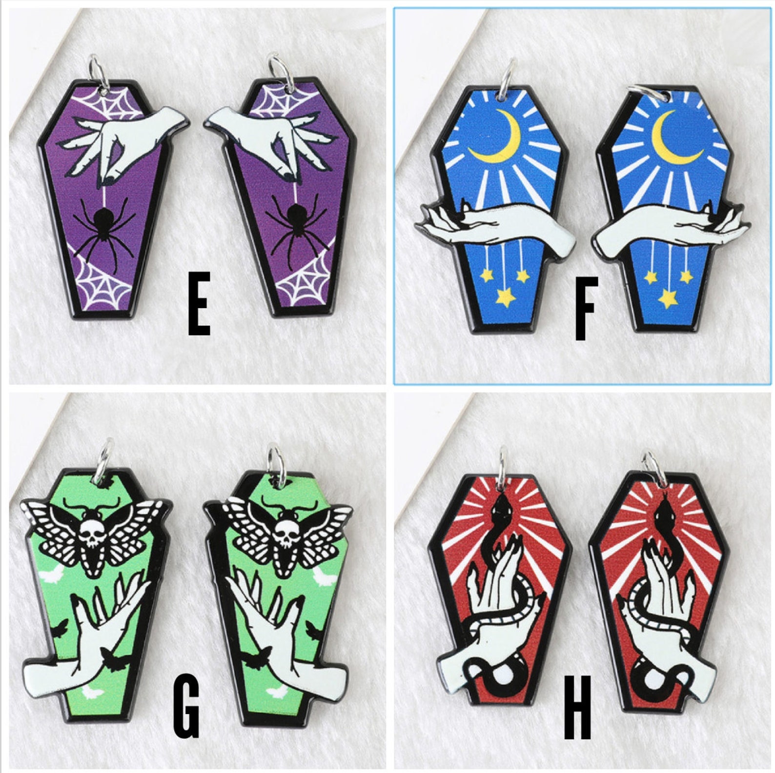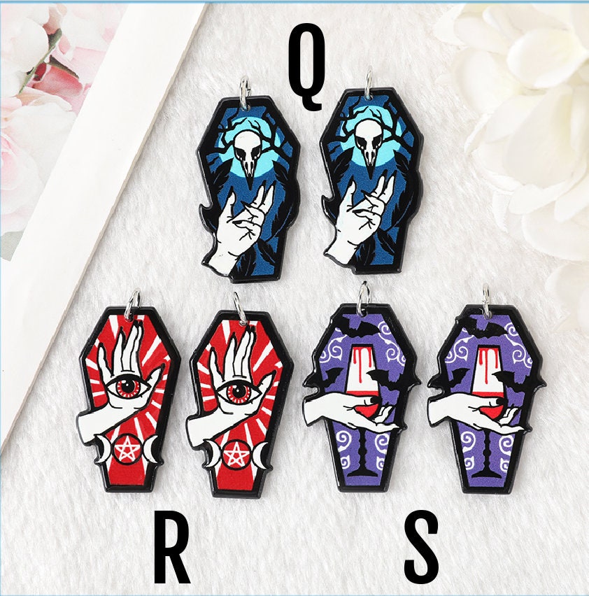 These pastel goth coffin acrylic charms feature ouija boards, tombstones, spooky hands and gothic symbols — perfect for Halloween jewelry and year-round goth vibes.