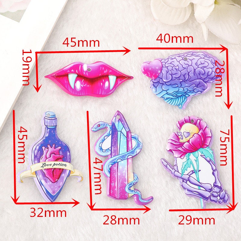 Creepy Valentine Acrylic Charms | Vampire Lips | Heart Brain | Love Potion | Skull Flower | Snake Magic | Ref: P25