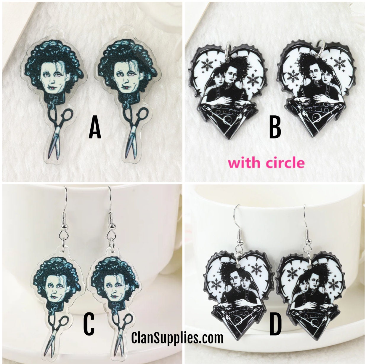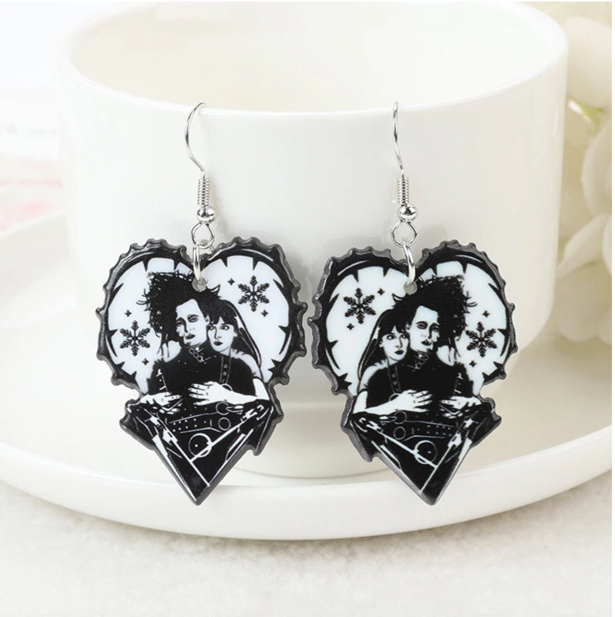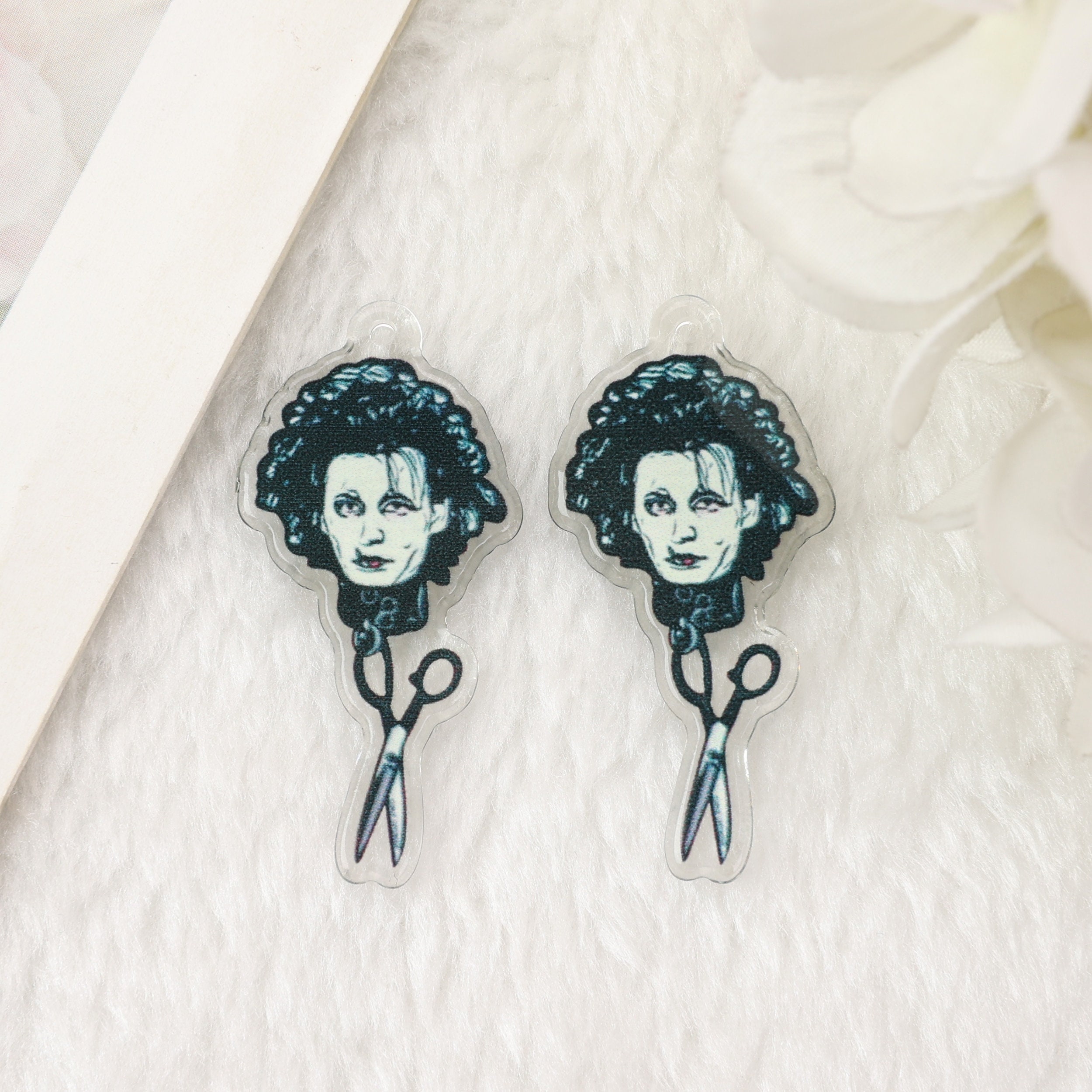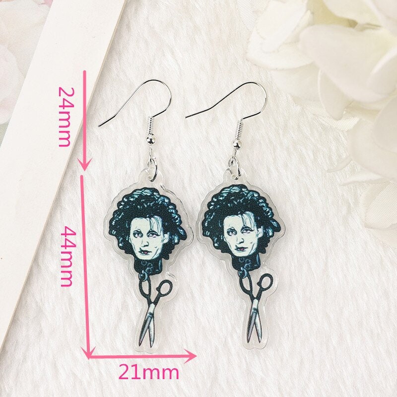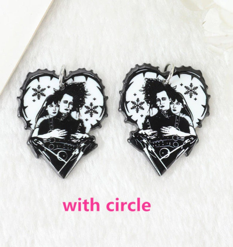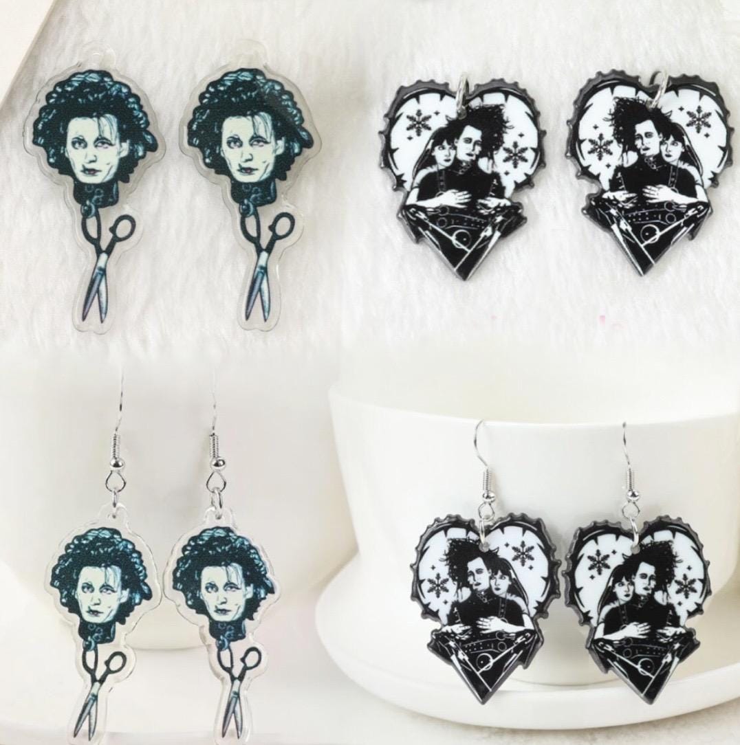 Iconic Edward Scissorhands–inspired acrylic charms featuring the unforgettable gothic character with scissors hands and romantic heart design. A must-have for movie lovers, goth aesthetics, and Tim Burton–style jewelry. Available as charms or ready-to-wear earrings.