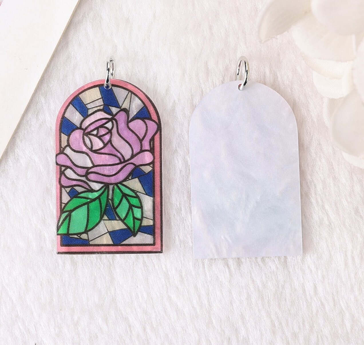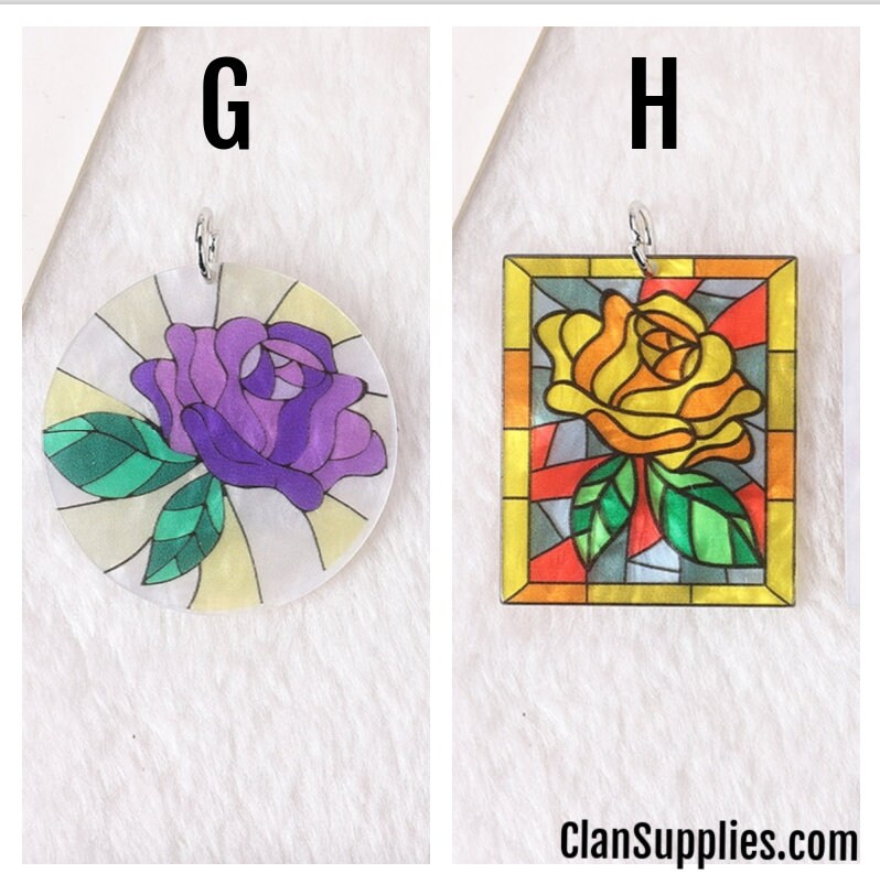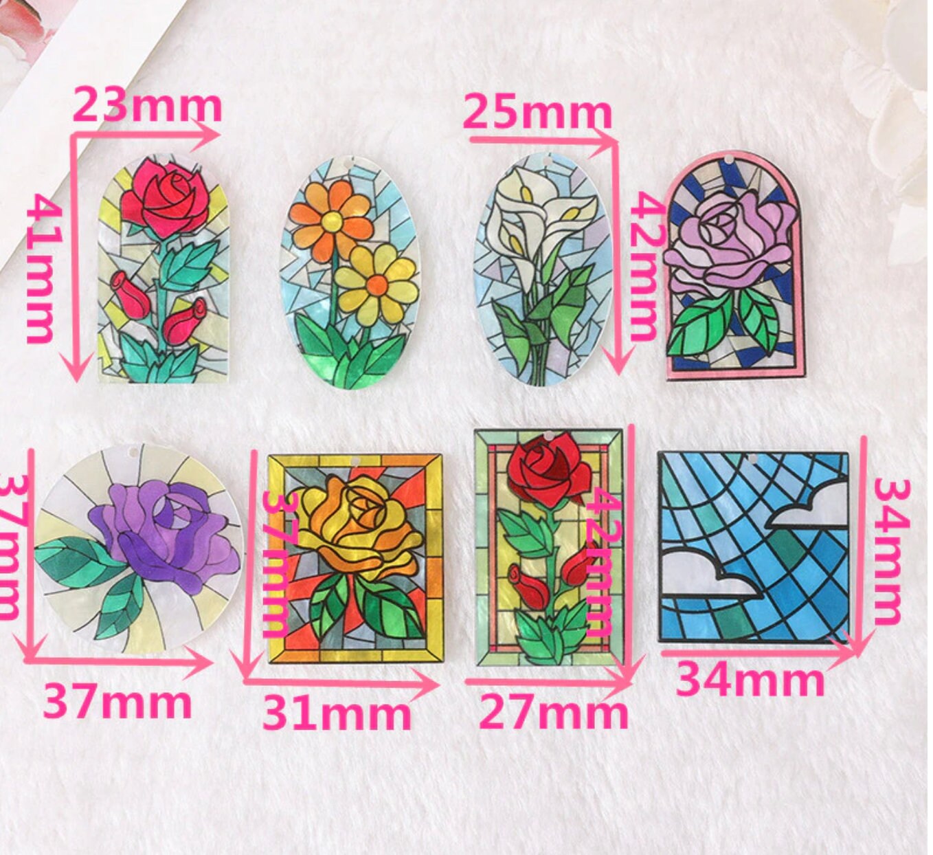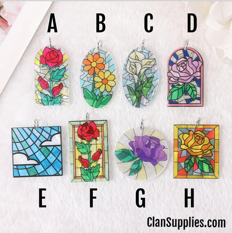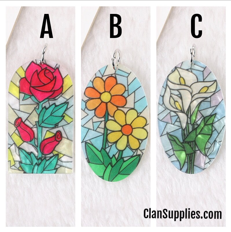Beautiful stained glass–style flower acrylic charms inspired by classic floral window art. Each design features vibrant colors and delicate line details, perfect for elegant, artistic, and handmade jewelry projects.
