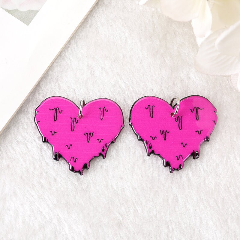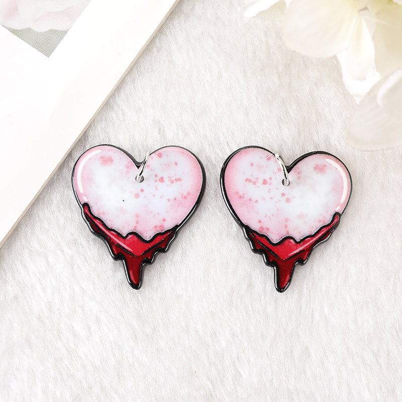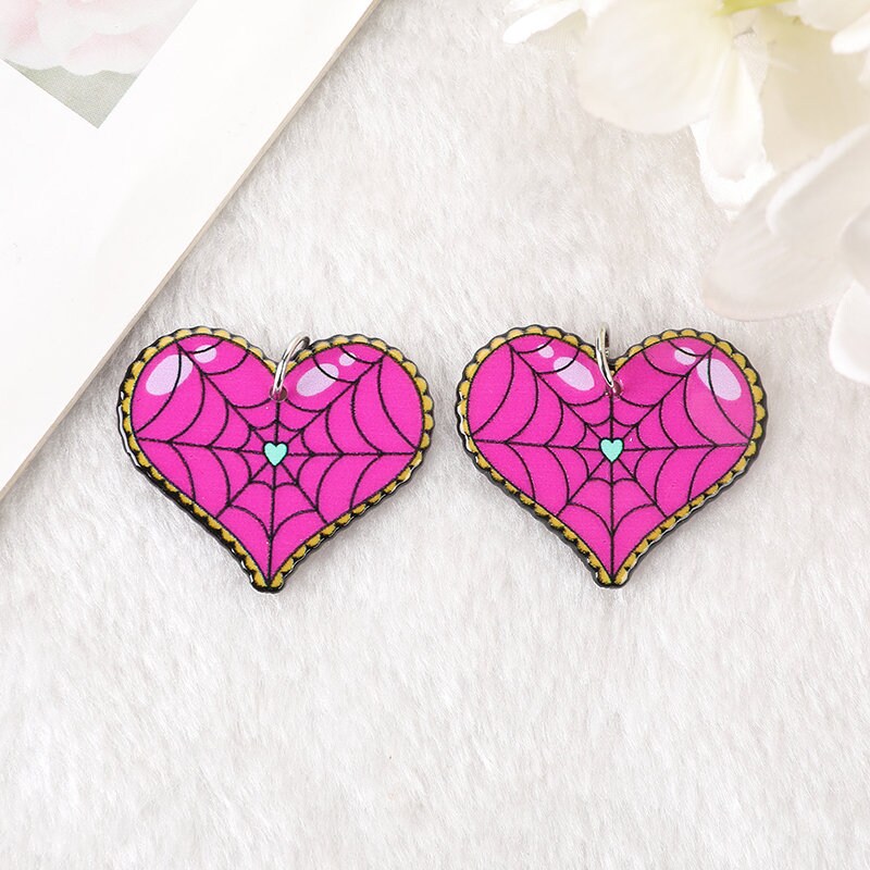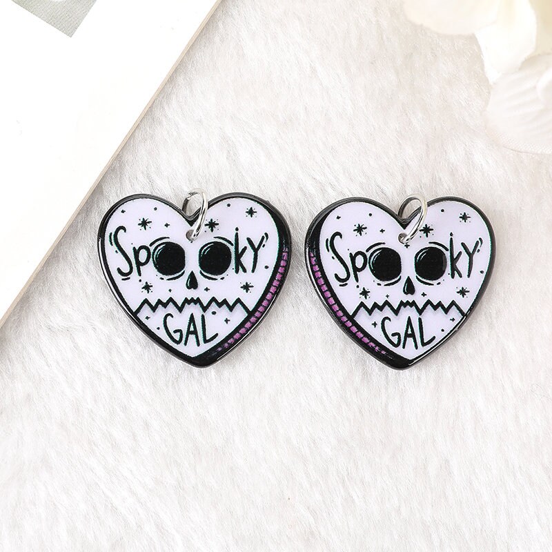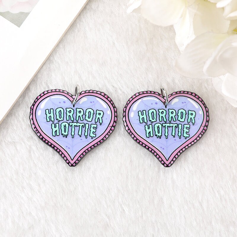 Spooky heart-shaped acrylic charms featuring horror, gothic and Halloween-inspired designs. Perfect for earrings, necklaces and creepy-cute DIY jewelry projects.