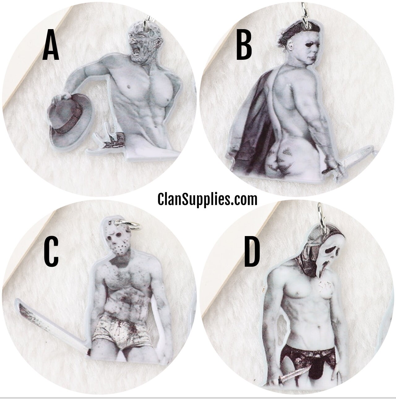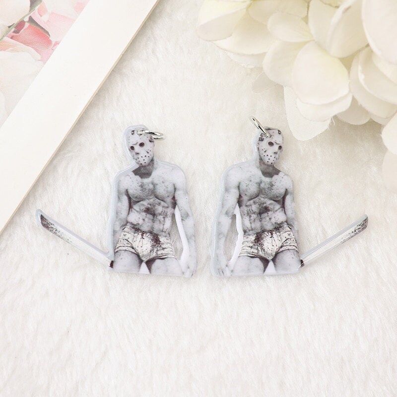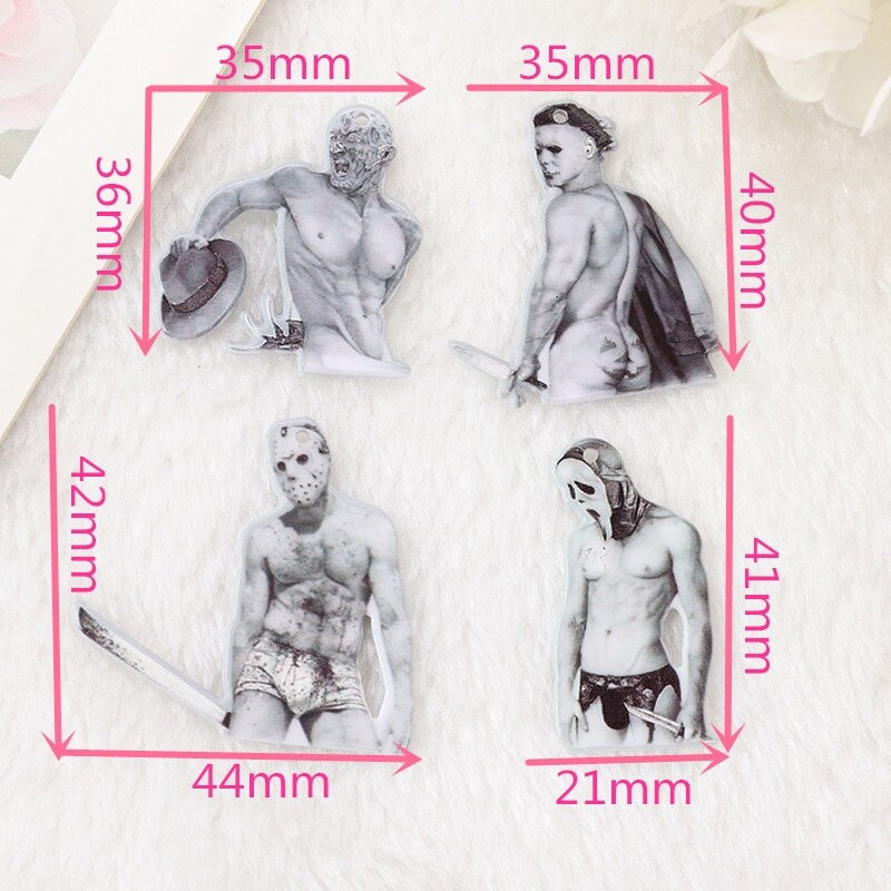 Spooky beefy horror movie acrylic charms featuring iconic masked killers — bold, edgy, and perfect for statement DIY jewelry.