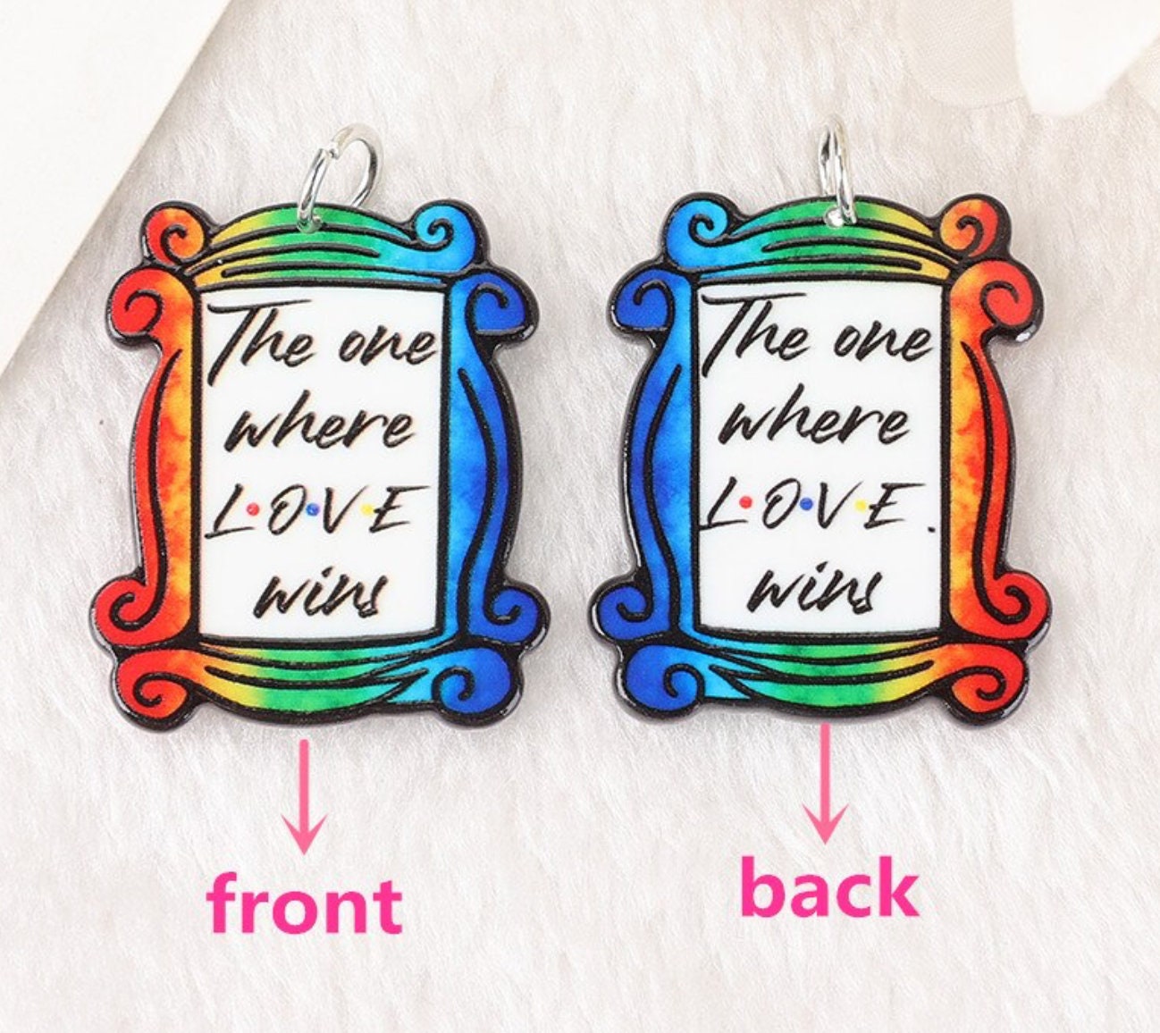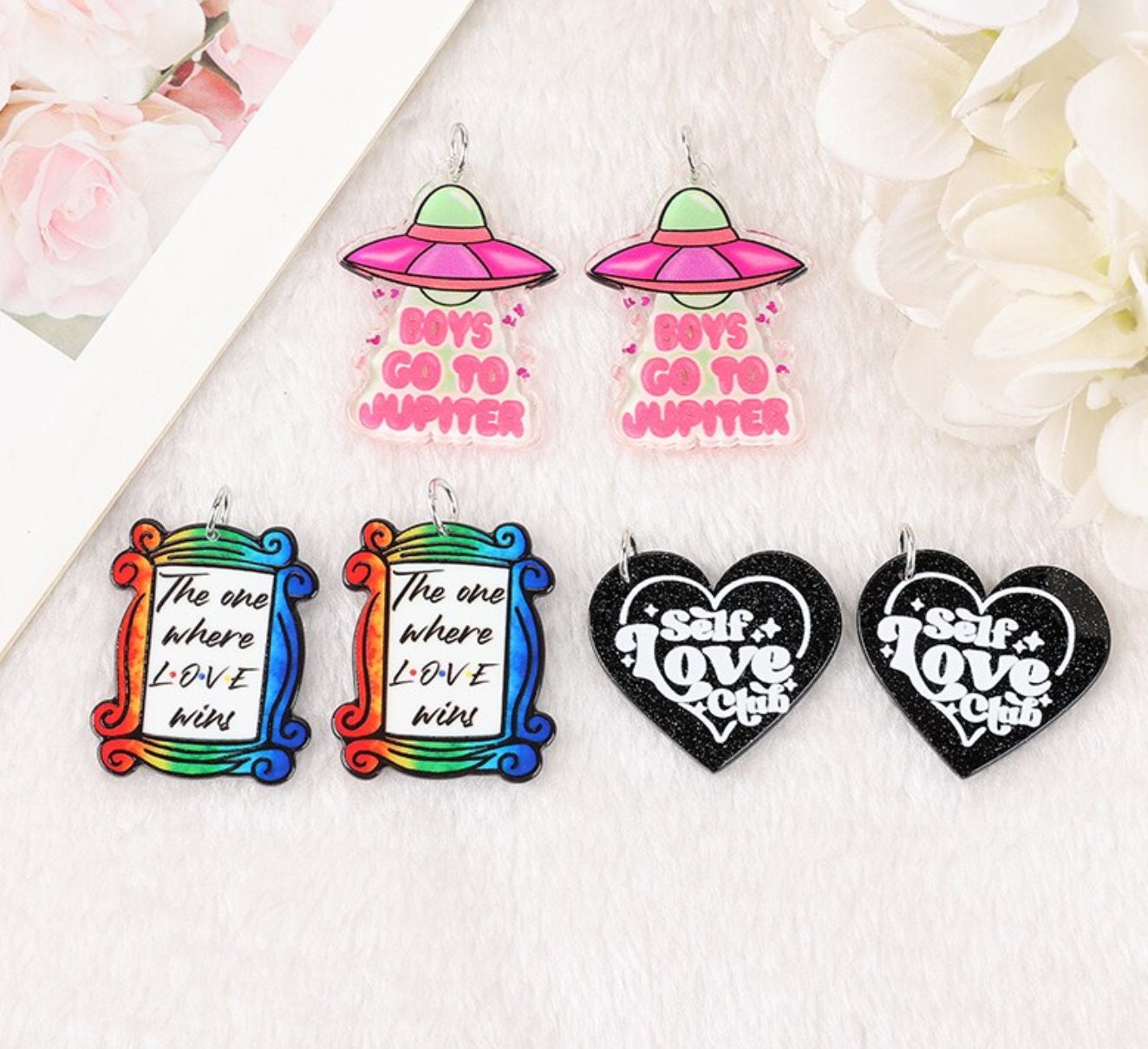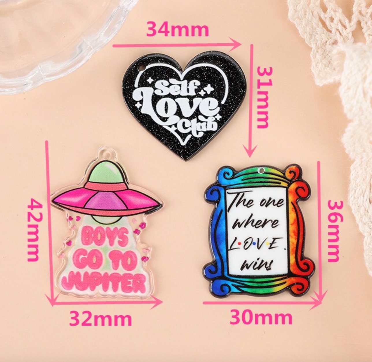 Colorful LGBT acrylic charms celebrating self-love, equality, and pride. Bold, fun designs perfect for inclusive jewelry, pride accessories, and statement DIY projects.