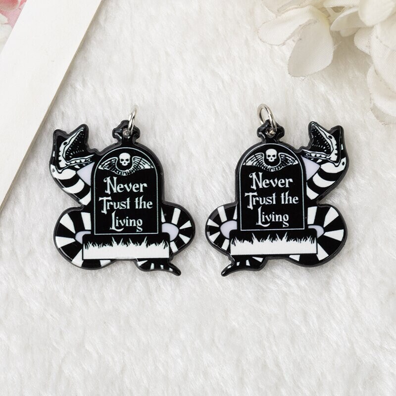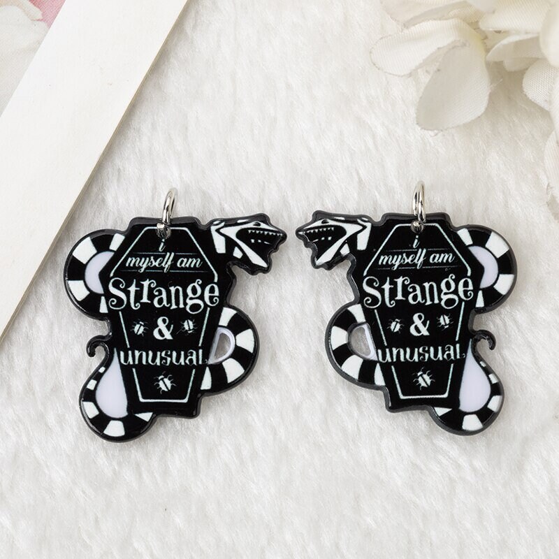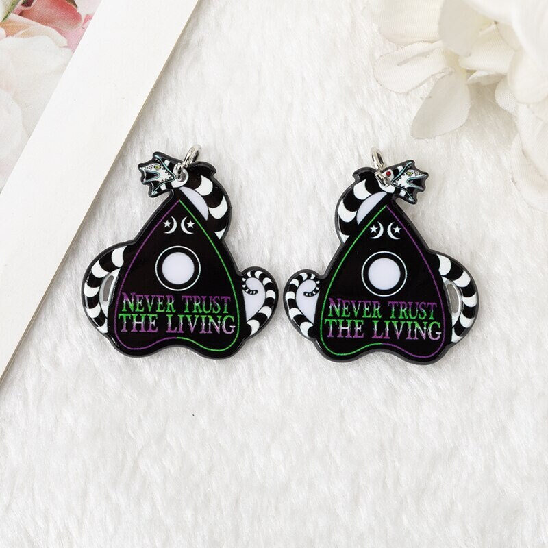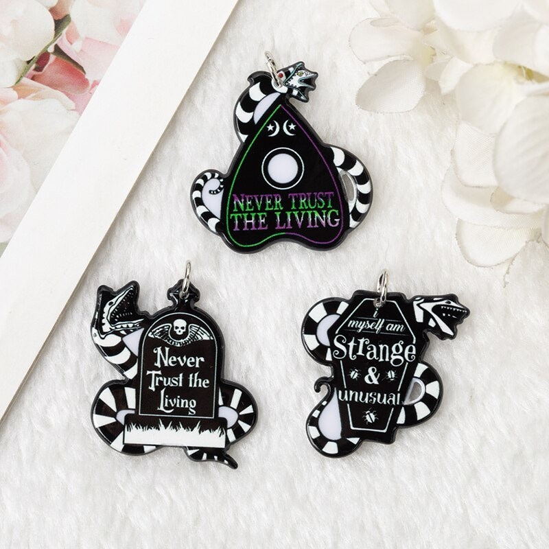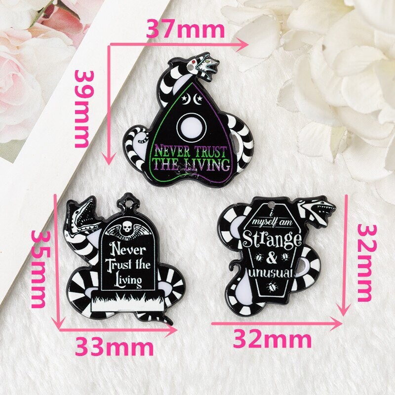 Spooky ouija-style snake acrylic charms featuring gothic phrases and eerie black-and-white designs. A must-have for horror, witchy, and dark aesthetic jewelry.