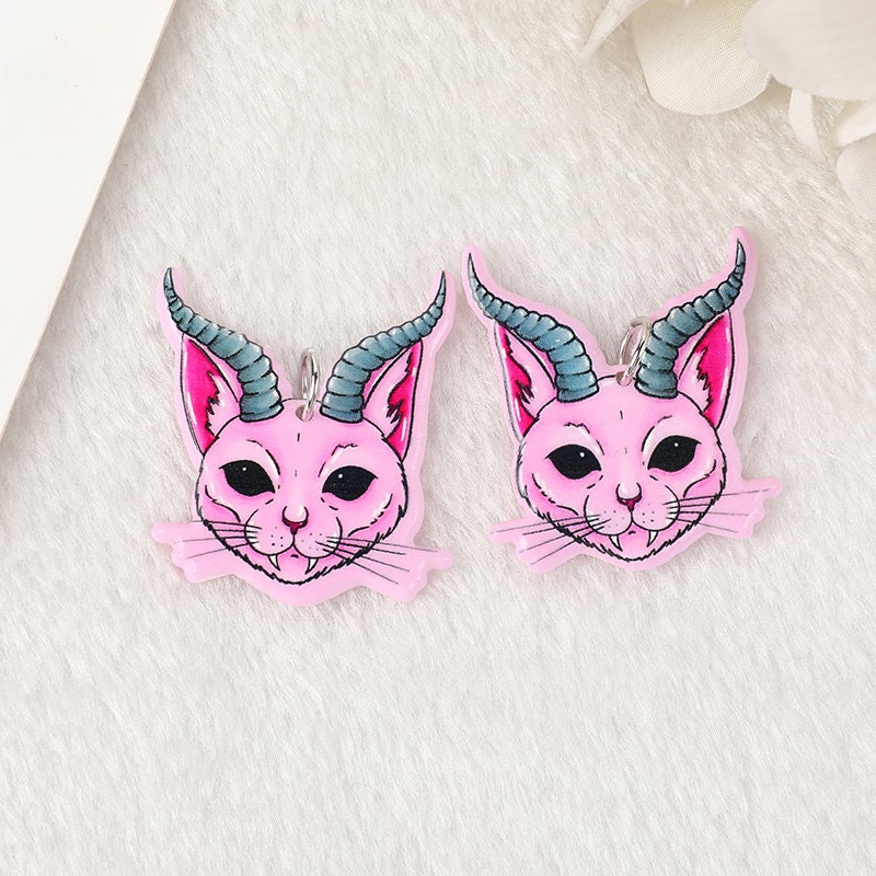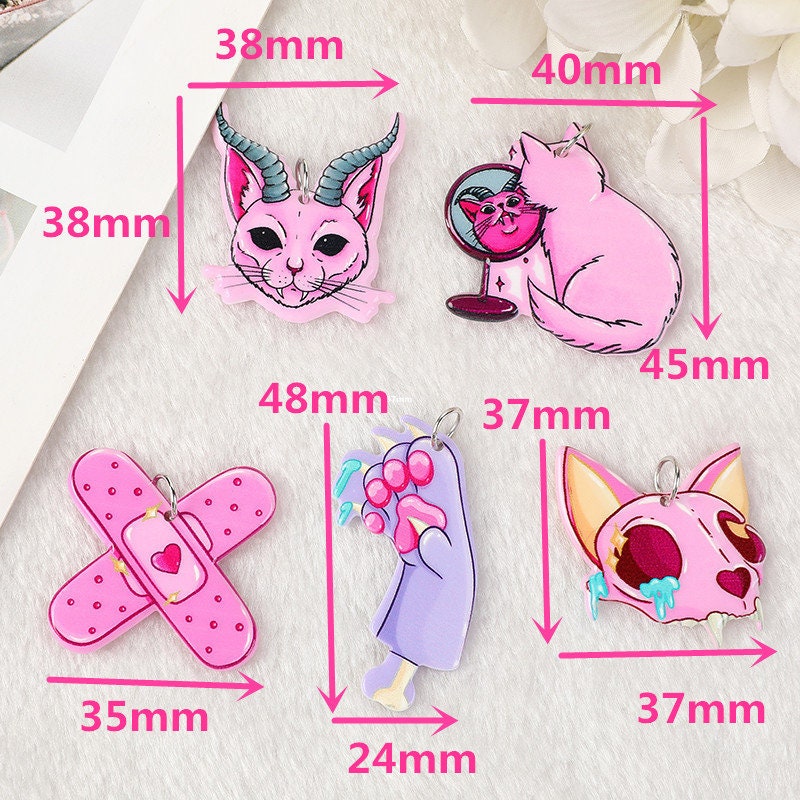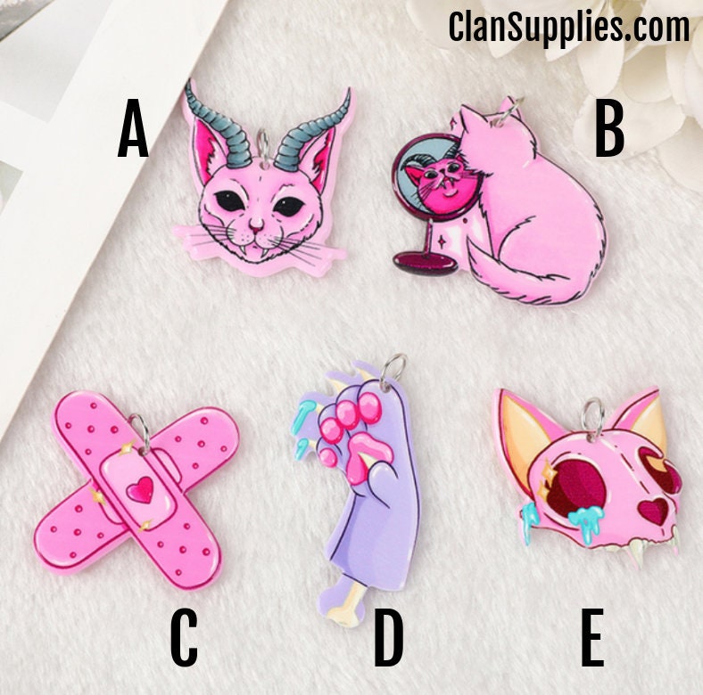 A spooky-cute collection of pastel goth acrylic charms featuring cats, claws, bandages, and dark fantasy details. Perfect for creating earrings, necklaces, keychains, and DIY accessories with a unique gothic twist.