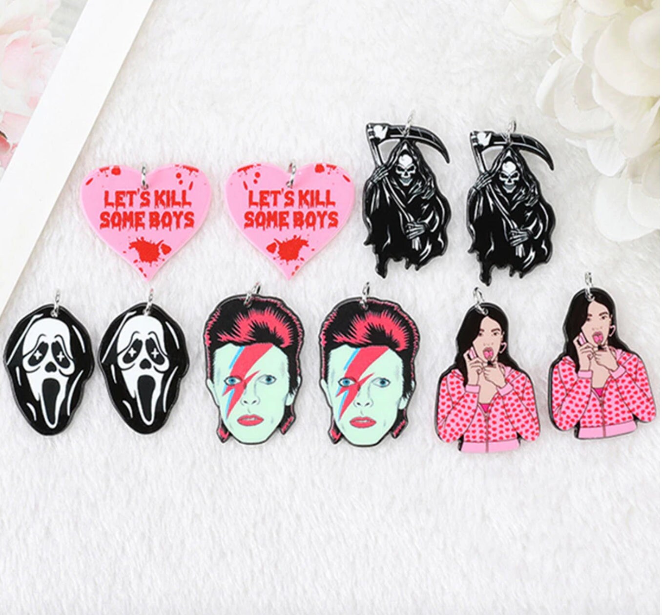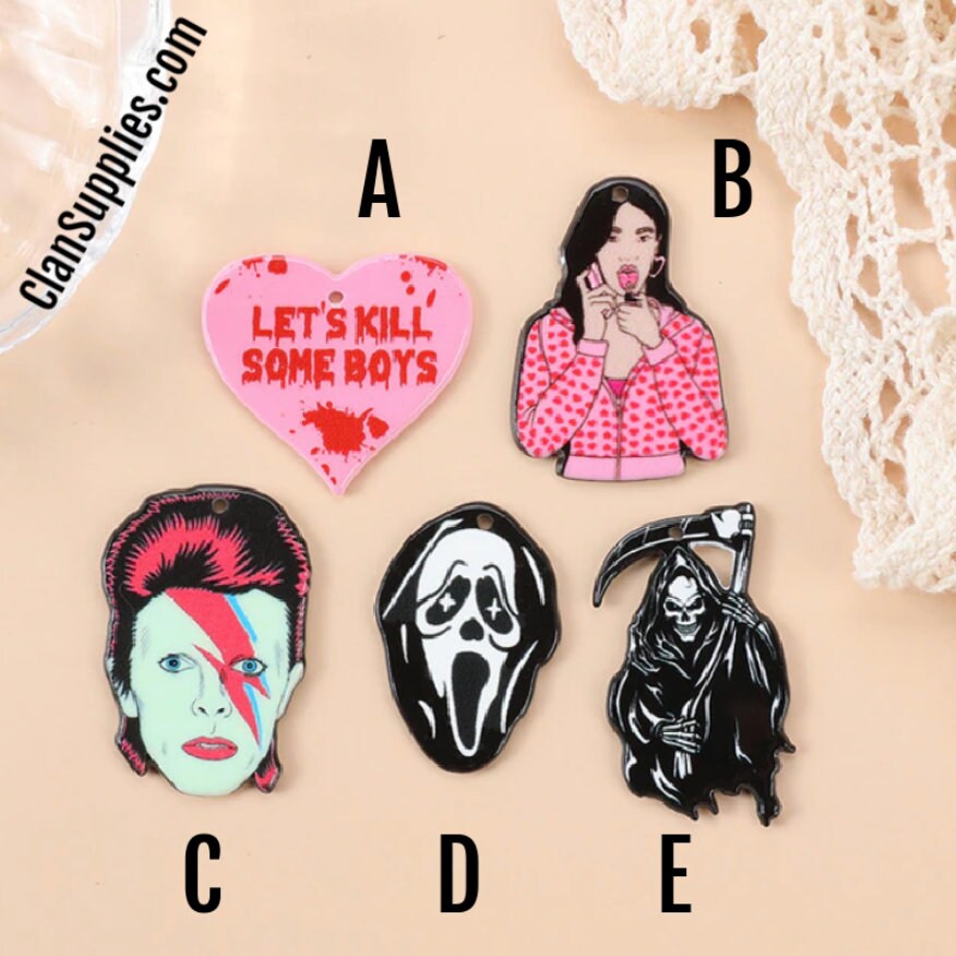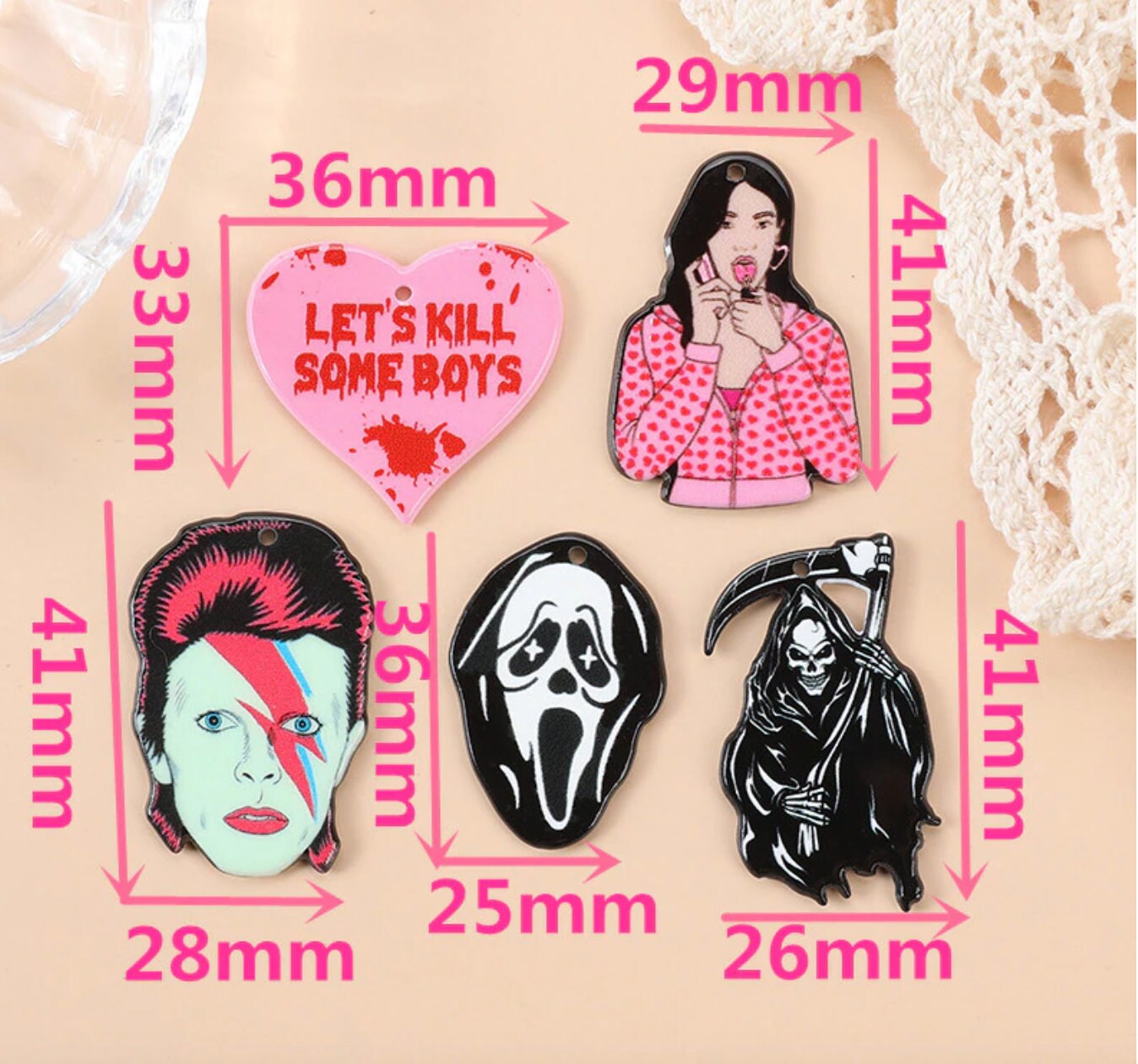 Acrylic charm set inspired by cult horror movies and iconic characters, including a bloody heart from Jennifer’s Body, Ghostface mask, Grim Reaper, and a David Bowie–inspired portrait. Bold, edgy charms perfect for spooky and alternative jewelry designs.
