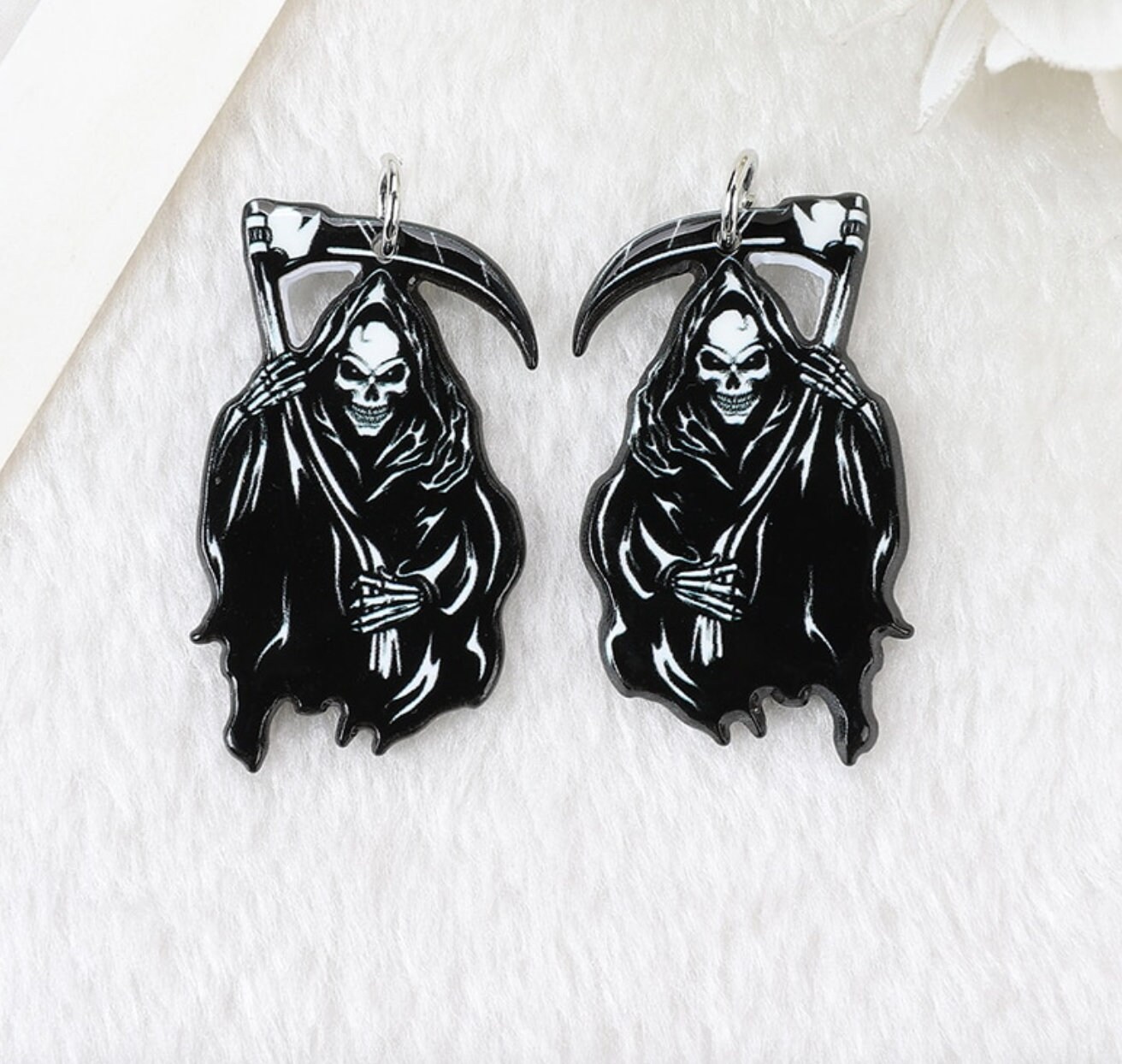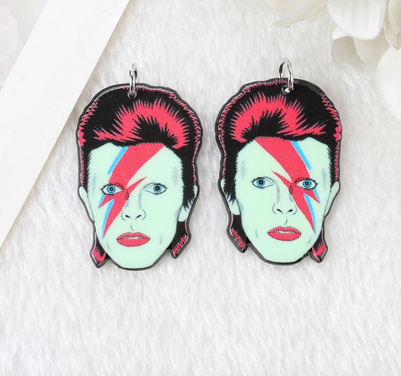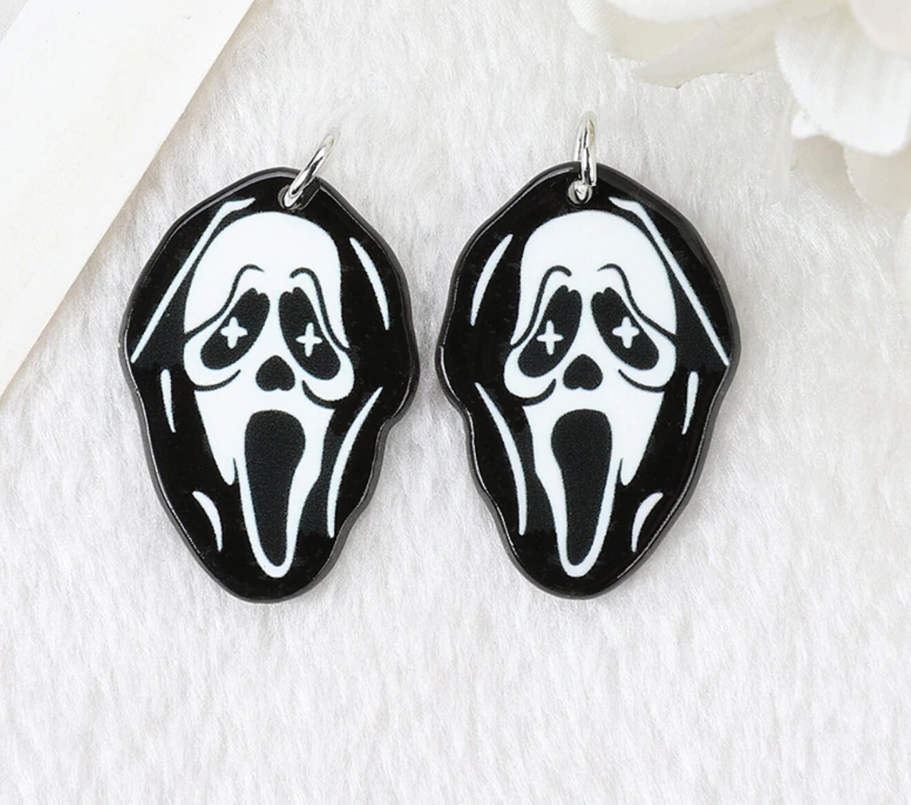 Acrylic charm set inspired by cult horror movies and iconic characters, including a bloody heart from Jennifer’s Body, Ghostface mask, Grim Reaper, and a David Bowie–inspired portrait. Bold, edgy charms perfect for spooky and alternative jewelry designs.